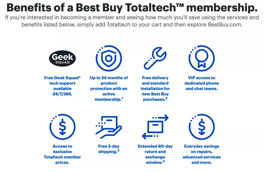 Zu den damit erworbenen Leistungen und Vergünstigungen zählten bislang ein kostenloser, rund um die Uhr verfügbarer Support durch die Hauseigene Geek Squad, erweiterte Garantie auf 24 Monate, kostenloser Versand und Installation sowie niedrigere Preise. Alles in allem Leistungen, die man eher als häufiger Kunde benötigt.